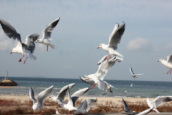 今年もユリカモメが北の国から帰ってきました。とても人懐っこい性格でこちらの姿を見つけると飛んできます。カモメの仲間では小柄なタイプで赤い脚が特徴的です。京都の鴨川にいる都鳥もこのユリカモメです。遠くの波打ち際に並んでいるのは、ウミネコの群れです。